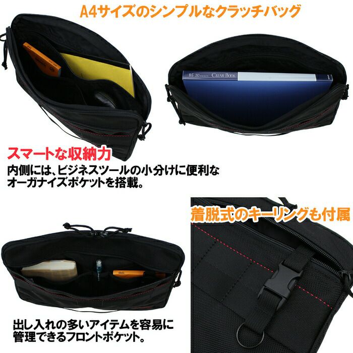 □サイズ:W350/H245/D10mm □重量:320g □素材:1050デニール バリスティックナイロン □仕様:【メイン:A4サイズ】ファスナーポケット(B5)×1、オープンポケット(A6)×2 【外側前面】ファスナーポケット(B5)×1(オープンポケット(A6)×2、ペンポケット×1、着脱式キーリング×1