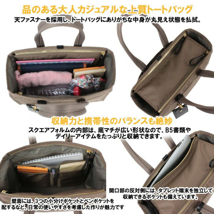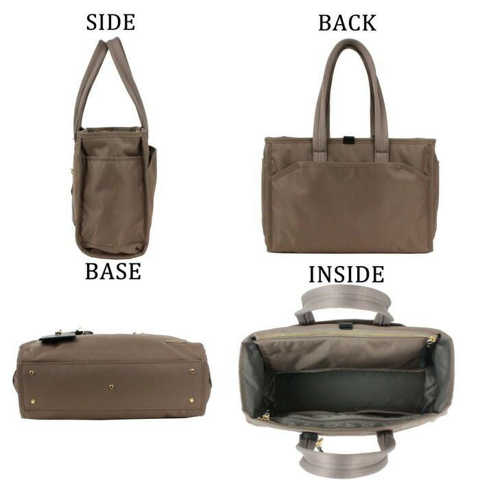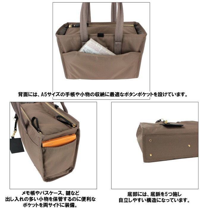 □サイズ:W320/H235/D120mm □重量:500g □素材:表:ナイロンポリエステルツイル(裏面:ウレタンコーティング)(ポリエステル綿ボンディング加工) 裏:ナイロンツイル(裏面:ウレタンコーティング) □仕様:【メイン:B5】ファスナーポケット(A5)×1、オープンポケット(A6)×2、ペンポケット×1 【サブメイン】ipad対応ポケット×1 【外側サイド】オープンポケット(小物)×2 【外側背面】ボタン留めポケット(A5)×1 【底部】底鋲×5 【付属品】ネームタグ×1(着脱可能) 【ハンドル高さ】約20cm 【ハンドル長さ】約52cm