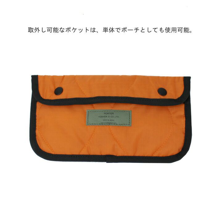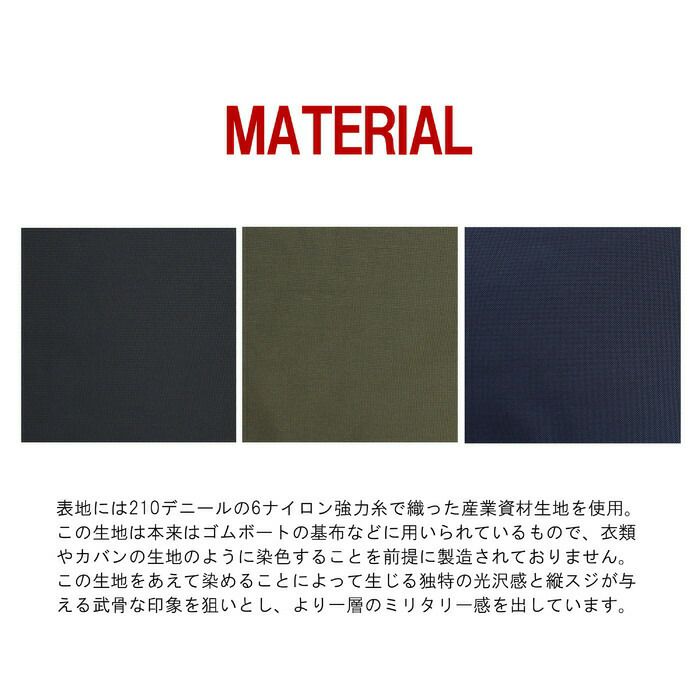 軍用品にたまに見られる偶発的な生地色の差をモチーフにし、フロントポケットの生地とカバン本体の生地に微妙な色の差を出すことで ロット違いの生地を使用しているように見せていることが最大の特徴。 外観はナイロン素材のバッグですが、持った時に初めてキルティングの軽さ、柔らかさが実感できる素材使いがこだわりです。