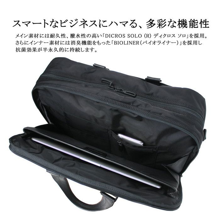 □サイズ:W420/H290/D140mm □重量:1085g □素材:本体:ポリエステル(DICROS SOLO(R)/ディクロス ソロ) □仕様:【メイン前層:B4サイズ】オープンポケット(A6)×1、オープンポケット(B6)×2 、ファスナーポケット(B5)×1 【メイン後層:B4サイズ】クッションオープンポケット(B4、15インチPC)×1、オープンポケット(A6)×2、オープンポケット(小物)×1 、ファスナーポケット(小物)×1 【前面】マグネットボタンポケット(B5)×1 【最前面】ファスナーポケット(B5)×1(オープンポケット(B7)×3、 ペンホルダー×2、キーフック×1) 【背面】マグネットボタンポケット(B5)×1(オープンポケット(B7)×1)、キャリーバー通し 【ハンドル】38cm 【ショルダーベルト】75~114cmまで長さ調節&取り外し可能 【付属】pelle morbida専用袋、ホイッスル
