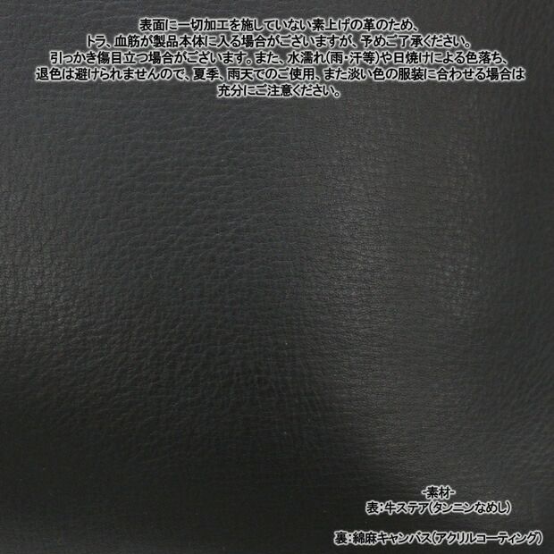 表面にいっさい加工を施していない素上げの革の為、トラ、血筋が製品本体に入る場合がございます。ご了承下さい。また水濡れ(雨・汗等)や日焼けによる色落ち、退色は避けられませんので、夏季、雨天でのご使用、また淡い色の服装に合わせる場合は十分にご注意下さい。