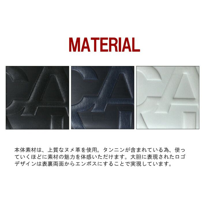 本体素材は、ヌメ革を使用。タンニンが含まれている為、使っていくほどに素材の魅力を体感できるカステルバジャックブランドの中でも革にこだわった上質な小物シリーズ。 大胆に表現されたロゴデザインは表裏両面からエンボスにすることで実現しています。デザインがダイナミックな分カラーは多色使いせずオトナっぽく仕上げています。
