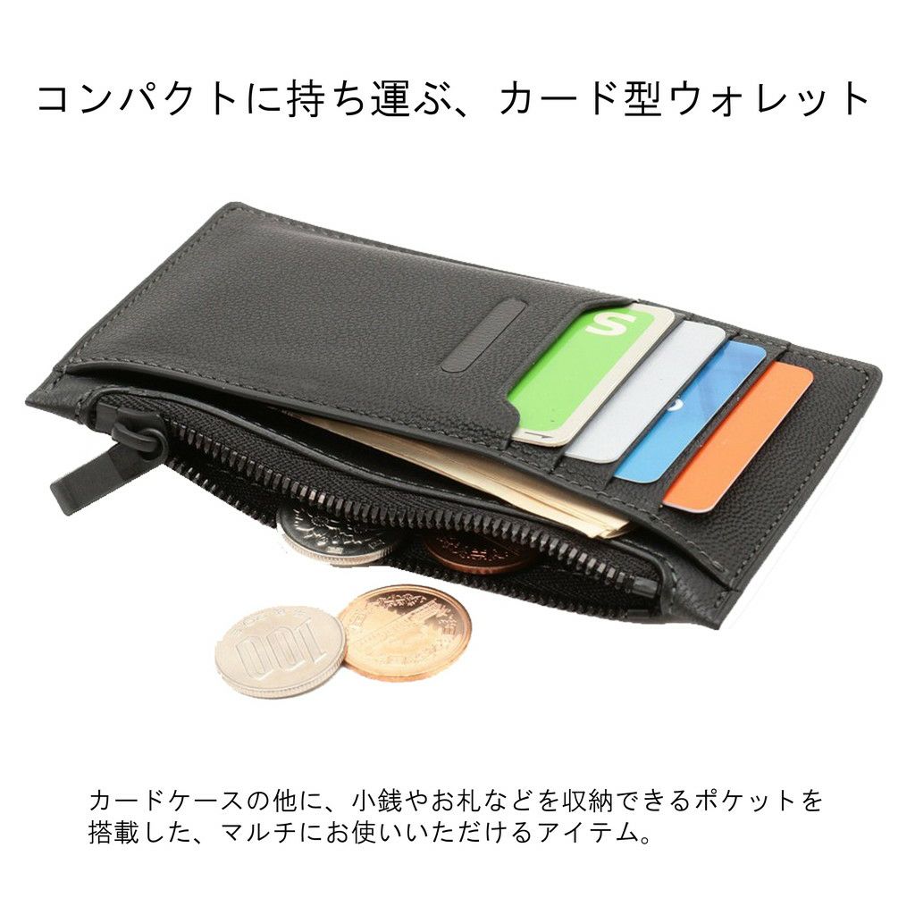 □サイズ:約W130×H75×D2mm ※サイズは当店計測サイズとなります。 商品により、若干の個体差が生じます。 ※サイズの表記について □重量:約30g □素材:ソフトレザー ( 防水皮革 ) □仕様:ファスナー式小銭入れ×1、カードポケット×4、フリーポケット×1 【付属】収納箱、収納袋