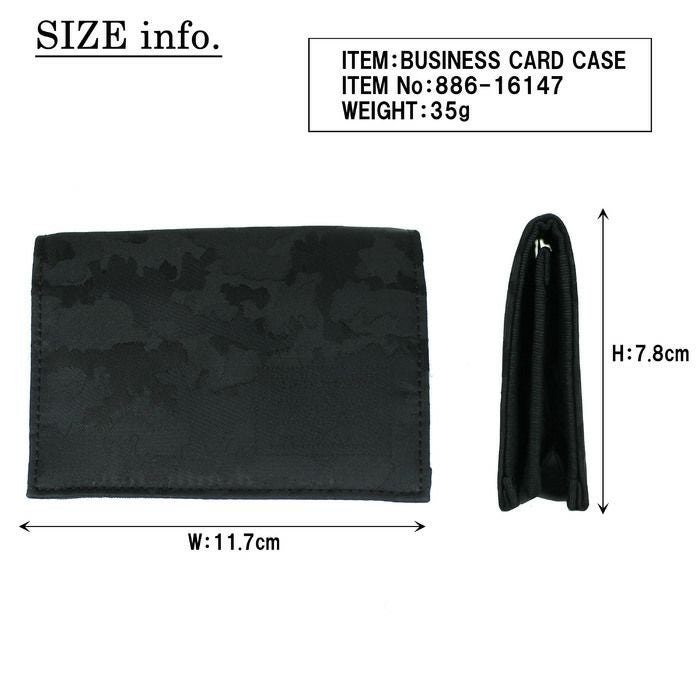 □サイズ:W117/H78mm □重量:35g □素材:表:ポリエステル高密ジャカード(糊加工) 裏:ナイロンツイル(裏面:アクリルコーティング) 付属:牛ステア(クローム鞣し) □仕様:【メイン】メインポケット(名刺約40枚収納可能)、カードポケット×1 ※オリジナルの納品袋が付属