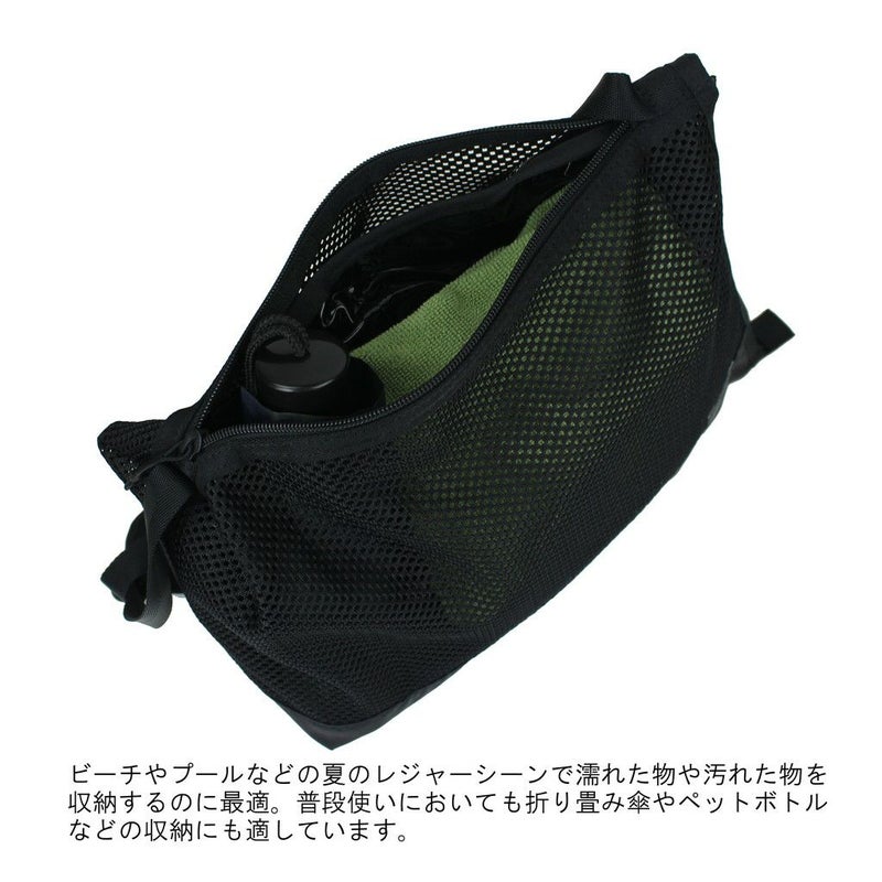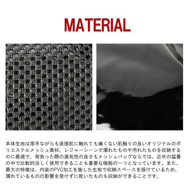 バッグ全体にメッシュ素材を採用した見た目にも涼しげなカジュアルシリーズ。 内装にPVC加工したナイロンリップストップ素材の収納スペースを取り付けることにより、湿ったものと乾いたものを分けて収納できる仕様で、特にレジャーシーンでの使用に機能を発揮しつつタウンユース機能も十分に持ち合わせているのが最大の特徴です。