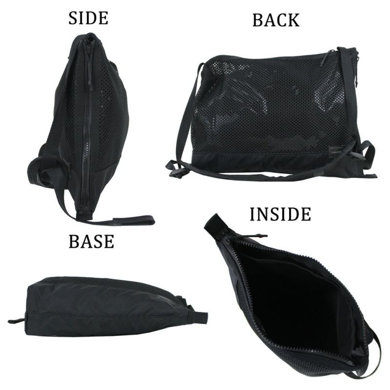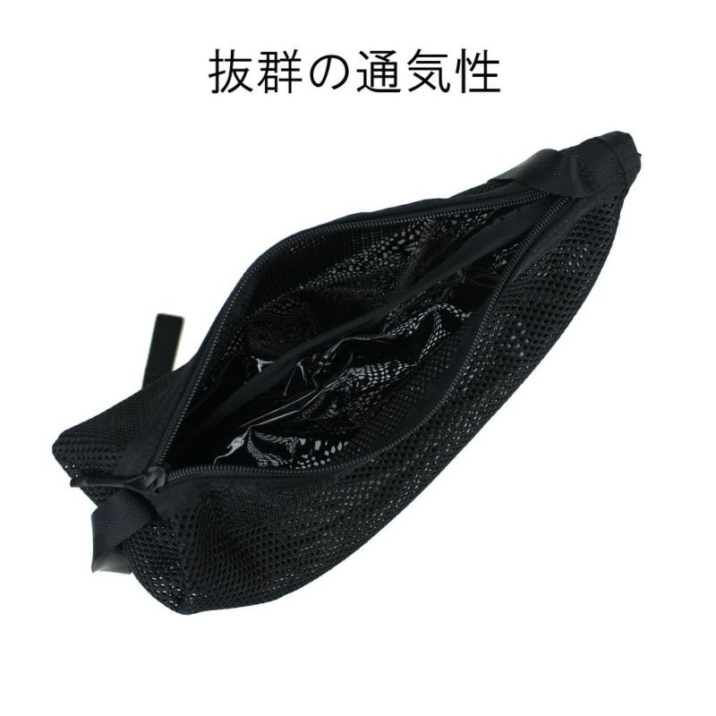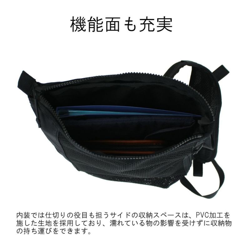 □サイズ:W340/H200/D110mm □重量:260g □素材:表:ポリエステルメッシュ 内装:ナイロンリップストップ(表面:PVC加工) 付属:ナイロンリップストップ(裏面:アクリルコーティング) 仕様:【メイン:A5】2層式 【サイド】ファスナーポケット(B5)(ボタン留めポケット(B6))→メイン2層の仕切り 【ショルダーベルト】約40~122cm、着脱不可