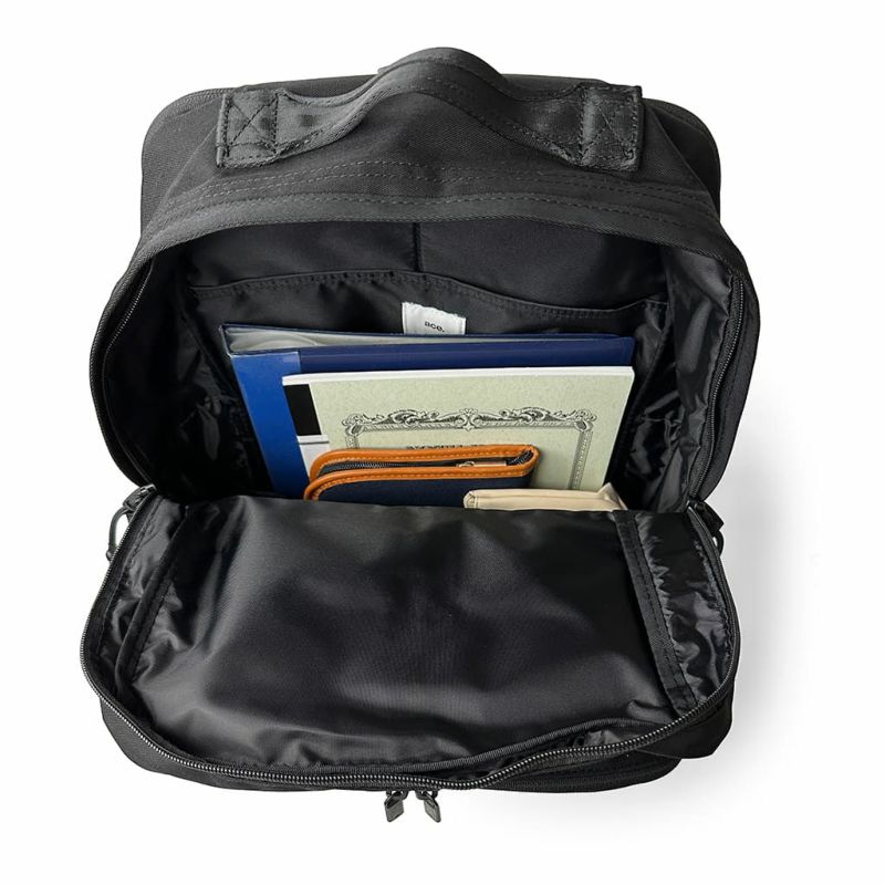 上部:ダブルファスナーポケット(A5)[オーガナイザーポケット:オープンポケット(A7)×2、ペンポケット×2]、ファスナーポケット(A6)