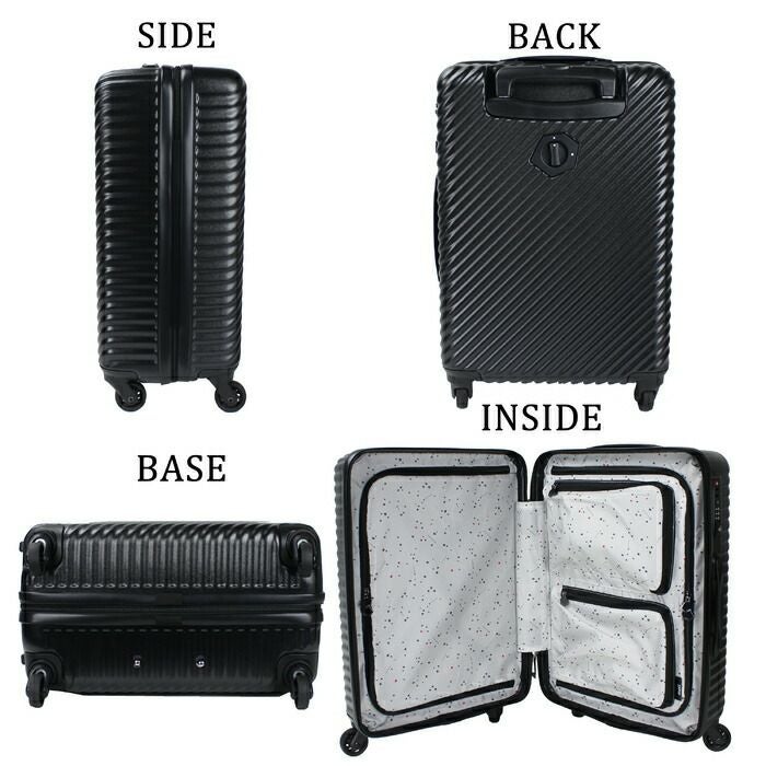 □サイズ:H48(54)/W34(36)/D22(22)cm □重量:2.7kg □素材:ポリカーボネイト □仕様:【メイン:前側】ファスナー式かぶせ、クロスベルト×1 【メイン:後側】バックル開閉式ディバイダー×1(メッシュファスナーポケット(A5)×2)、クロスベルト×1 【外側背面】キャスターストッパ-つまみ 【持ち手】サイド、上部 【キャリーバー】3段式 【キャスター】4輪 【施錠】TSAスリーダイヤルロック(※キーは付属しておりません) 【付属品】キャスターカバー×5、ポーチ×1