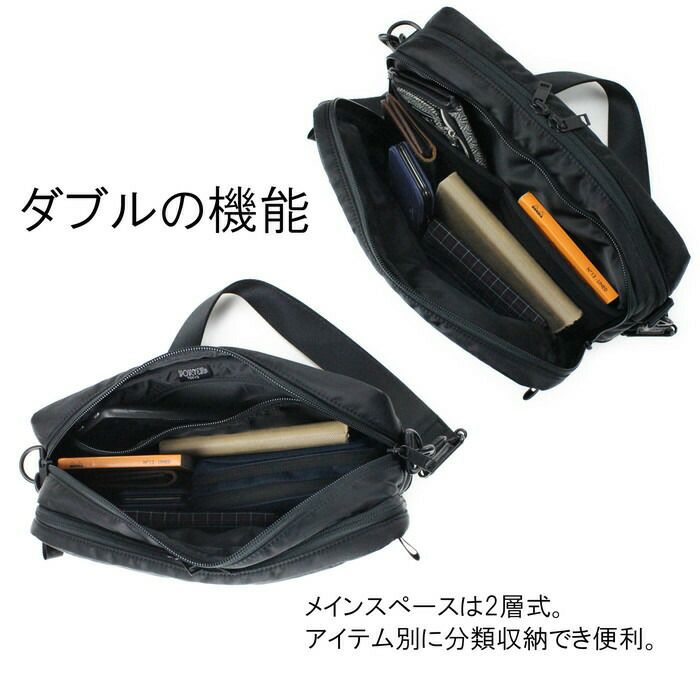 □サイズ:W280/H200/D90mm □重量:460g □素材:表:ナイロンツイル(ポリエステル綿ボンディング加工) 裏:ナイロンオックス(裏面:アクリルコーティング) 付属:コーデュラ(R)ナイロンオックス(ウレタンコーティング) □仕様:【メイン前層:B5】メッシュオープンポケット(A6)×2 【メイン後層:B5】クッション付きファスナーポケット(A5)×1 【外側前面】止水仕様ファスナーポケット(B6)×1 【ショルダーベルト】約92~150cm、着脱可能