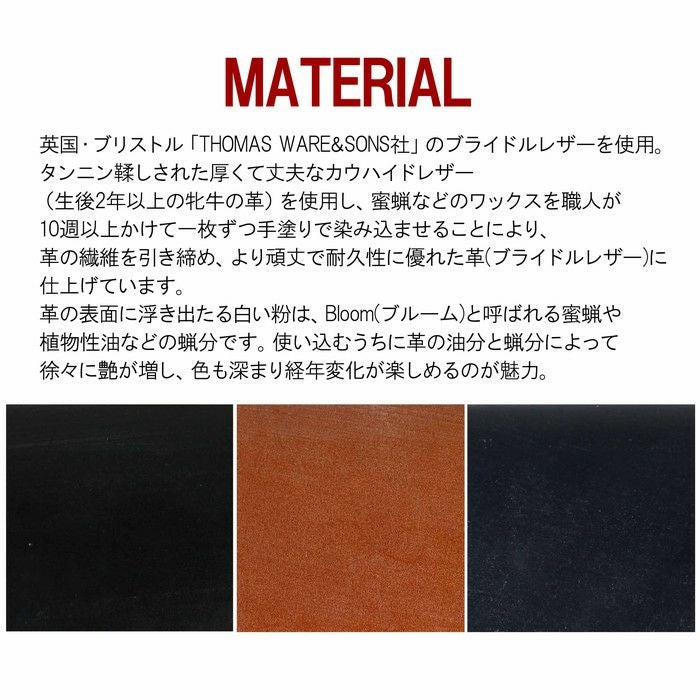 英国・ブリストル「THOMAS WARE&SONS社」のブライドルレザーを使用。 重厚感のある肉厚のブライドルレザーを薄く漉いて軽さを出し、内装の要所にも表革と同じ革を使用するなど贅沢に仕上げました。 職人技術を感じ取れる切り目のコバの仕上げも丁寧に磨かれており、ベーシックなデザインながらもシャープでスッキリとした印象が特徴です。