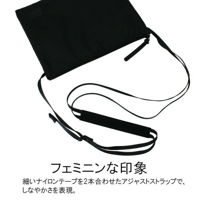 □サイズ:W270/H200mm □重量:120g □素材:表:超高密度ナイロンツイル(裏面:アクリルコーティング) 裏:ポリエステルツイル(裏面:アクリルコーティング) □仕様:【メイン】3層(A5サイズ) 【ショルダーベルト】約95~123cm、本体から着脱不可