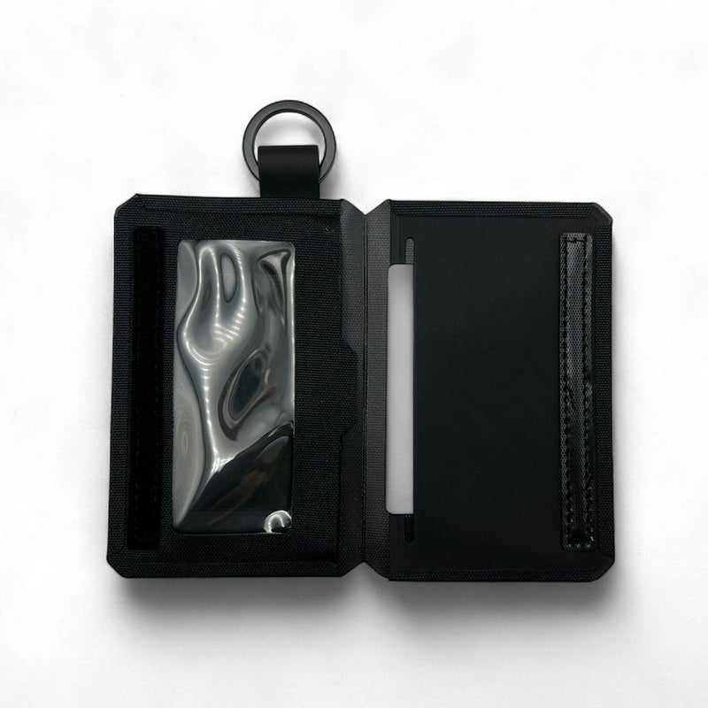糸による縫製をせずに、溶着のウェルディング技術で美しく仕上げた多用途に使えるケースです。 素材には、環境に配慮したリサイクルポリエステルを使用。 面ファスナーで開閉できる内側に、カードホルダーとクリアポケットを設置。 カバンに連結したりストラップを付けるなどのアレンジが可能なキーリング付きです。 カードケースやパスケース、ウォレットなどさまざまな使い方ができます。