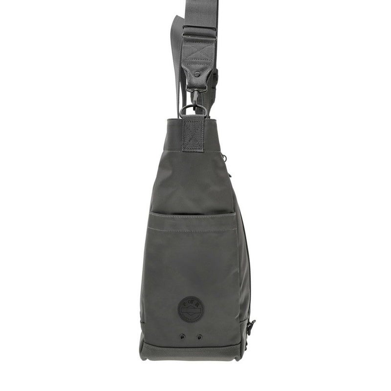 メイン素材にナイロンツイル生地を使用しており、PVC加工を施すことで耐水性を高めています。負荷のかかりやすい底マチ部分にはコーデュラバリスティックナイロンを採用し、耐久性も上げました。本体の前面や底面に身の回りのものを簡易的に固定して持ち運ぶことができるスリングバインダーも配しています。バックパックやウエストバッグはテープをクロスさせることで、見た目のアクセントにしました。ショルダーストラップはワンアクションで滑らかな調節が可能な画期的な仕様です。
