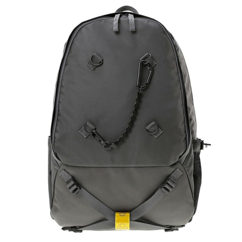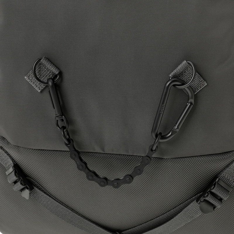 メイン素材にナイロンツイル生地を使用しており、PVC加工を施すことで耐水性を高めています。負荷のかかりやすい底マチ部分にはコーデュラバリスティックナイロンを採用し、耐久性も上げました。本体の前面や底面に身の回りのものを簡易的に固定して持ち運ぶことができるスリングバインダーも配しています。バックパックやウエストバッグはテープをクロスさせることで、見た目のアクセントにしました。ショルダーストラップはワンアクションで滑らかな調節が可能な画期的な仕様です。