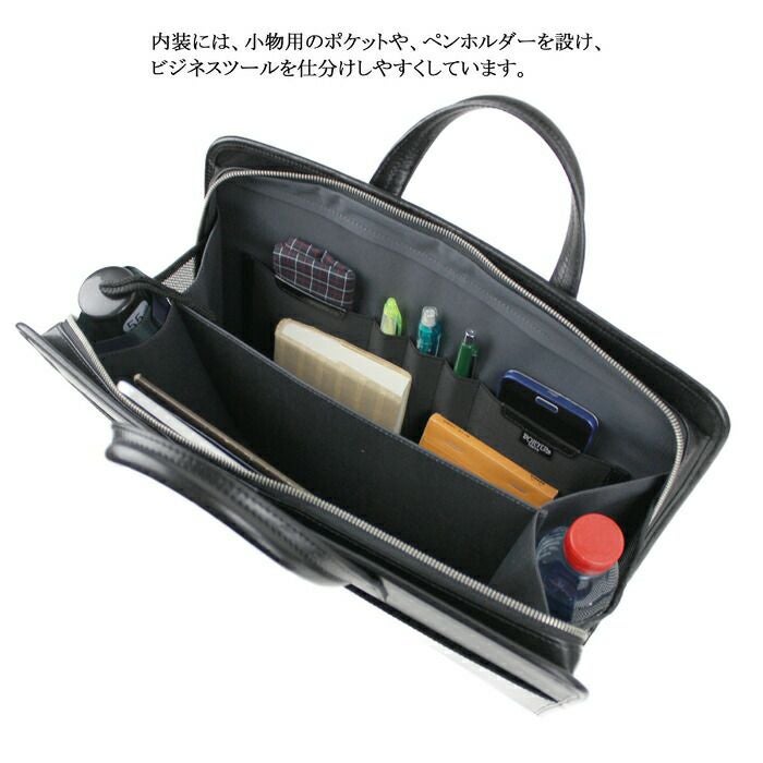 □サイズ:W400/H280/D80mm □重量:1,120g □素材:表:牛ステア(コンビネーション鞣し) 裏:コットンヘリンボーン(裏面:アクリルコーティング) 仕様:【メイン:A4サイズ】オープンポケット(A4)×1、オープンポケット(B7)×2、ペンホルダー×3、両サイドにメッシュボトルホルダー×2 【外側前面】ファスナーポケット(B6)×1 【外側背面】オープンポケット(B6)×2 【底部】底鋲×5 【ハンドル長さ】約27cm 【付属品】オリジナル収納袋&BOX