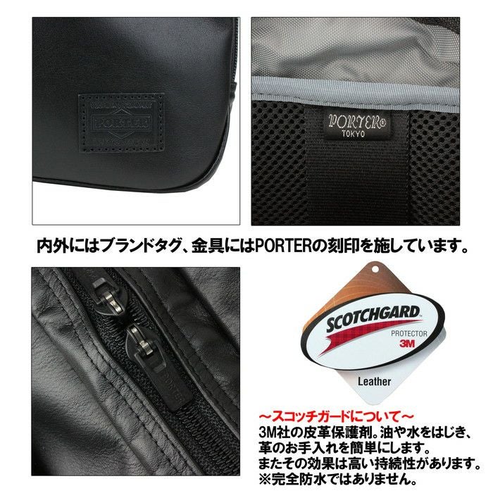 2015S/Sに発表した、PORTER TIMEのレザーバージョン。 スタンダードなルックスに高い機能性を備えたビジネスシリーズとしての特徴はそのままに、メイン素材を革にアップグレードし、全体をブラックワントーンにすることで上品でシックな印象に仕上げました。ビジネスシーンでの使用を想定し、撥水・撥油に優れた革に仕上げているので、多少の雨を弾き、水ぶくれを防ぐとともに撥油の効果で手入れも容易です。