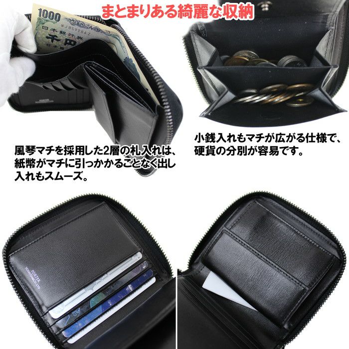 □サイズ:W110/H100mm □重量:120g □素材:表:牛キップ(コンビネーション鞣し) 裏:ナイロンサテン(裏面:アクリルコーティング) 付属:牛ステア(コンビネーション鞣し) □仕様:【メイン】札入れ×2、ボタン留め小銭入れ(2層式)×1、カードポケット×4