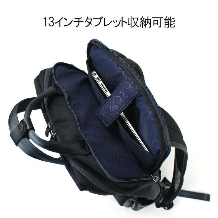 □サイズ:W290/H420/D100mm □重量:970g/10L □素材:ナイロンコーデュラ210×500dnサテンPU加工/人工皮革 □仕様:【メイン前気室:A4サイズ】ボタン留めウォーターシールドポケット(A5)×1、メッシュファスナーポケット(A5)、USBポート×1 【メイン後気室:A4サイズ】ベルクロ留めクッションポケット(13インチPC収納可能)×1、オープンポケット(A5)×1 【外側前面】ペンホルダー×2、オープンポケット(B7)×2、オープンファスナーポケット(小物)×2 【外側最前面】ファスナーポケット(A5)×1 【背面】キャリーハンドルバー通し×1、Dカン×2 【サイド】ボトルホルダー×1、ファスナーポケット(小物)×1 【肩ベルト】約45~85cm