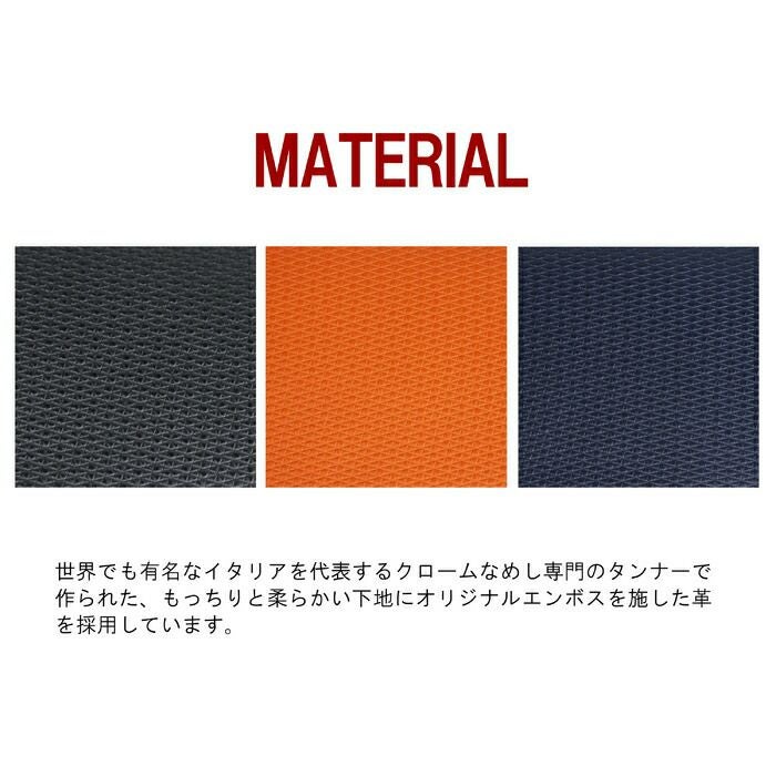 世界でも有名なイタリアを代表するクロームなめし専門のタンナーで作られた、もっちりと柔らかい下地にオリジナルエンボスを施した革を使用。 プレートに施したen Bleuの部分がブルーに着色されたロゴがポイントです。