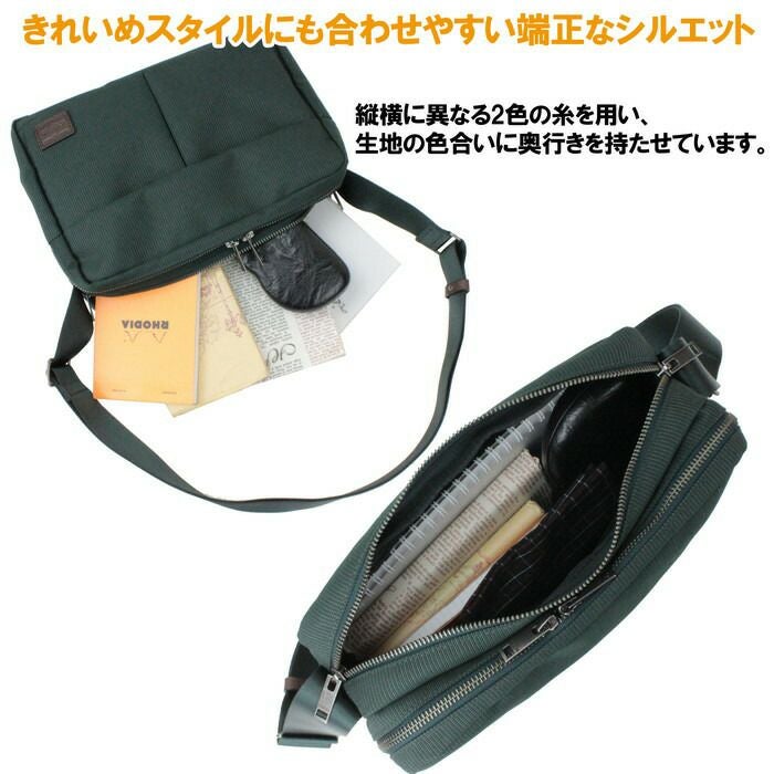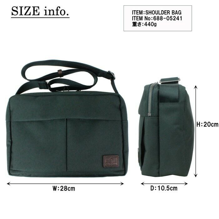 □サイズ:W280/H200/D105mm □重量:440g □素材:表:ポリエステルジャガード(裏面:PVC加工)、裏:ナイロンオックス(裏面:ウレタンコーティング)、付属:牛ステア(タンニン鞣し) □仕様:【メイン:前(A5サイズ)】ボタン留めポケット(B6サイズ)×1、オープンポケット(A6サイズ)×2 【メイン:後(A5サイズ)】ファスナーポケット(A5サイズ)×1 【外側前面】ボタンかぶせポケット(A6サイズ)×2 【ショルダーベルト】約78~135cm、着脱不可