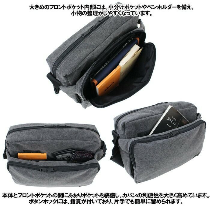 □サイズ:W330/H230/D140mm □重量:475g □素材:表:ナイロンポリエステルヘリンボーン(塩縮加工)(裏面:アクリルコーティング) 裏:ナイロンオックス(裏面:アクリルコーティング) 一部:ナイロンバイオライナー(R)(裏面:アクリルコーティング) □仕様:【メイン:A4サイズ】ファスナーポケット(A5)×1、ドリンクホルダー×1 【本体と外側フロントポケットの間】ボタン留めポケット(A5)×1(ベルクロ留めポケット(B7)×2内蔵) 【外側フロント】ファスナーポケット(B5)×1(オープンポケット(A6)×1、オープンポケット(小物)×1、ペンポケット×2内蔵) 【ショルダーストラップ】約74~134cmまで調節可能、着脱不可