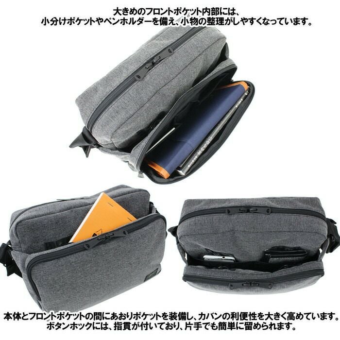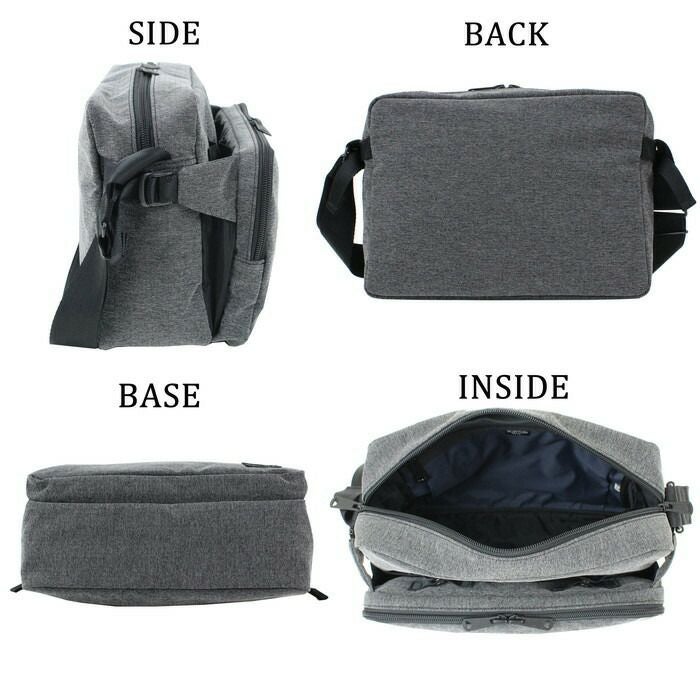□サイズ:W280/H210/D90mm □重量:395g □素材:表:ナイロンポリエステルヘリンボーン(塩縮加工)(裏面:アクリルコーティング) 裏:ナイロンオックス(裏面:アクリルコーティング) 一部:ナイロンバイオライナー(R)(裏面:アクリルコーティング) □仕様:【メイン:B5サイズ】ファスナーポケット(A5)×1、ドリンクホルダー×1 【本体と外側フロントポケットの間】ボタン留めポケット(B6)×1(ベルクロ留めポケット(小物)×2内蔵) 【外側フロント】ファスナーポケット(A5)×1(オープンポケット(B7)×2、ペンポケット×1内蔵) 【ショルダーストラップ】約75~135cmまで調節可能、着脱不可