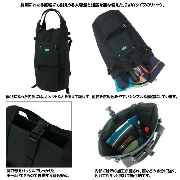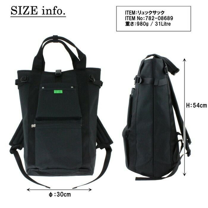 □サイズ:φ300/H540mm □重量:980g / 31Litre □素材:ポリエステルキャンバス □仕様:【メイン】バックル式開閉 【外側前面】オープンポケット(中)×1、吊りポケット(小)×1、ファスナーポケット(中)×1 【外側サイド】マチ幅調整ベルト×2 【肩ベルト】最大で約95cmまで調節可能 【ハンドル長さ】約60cm