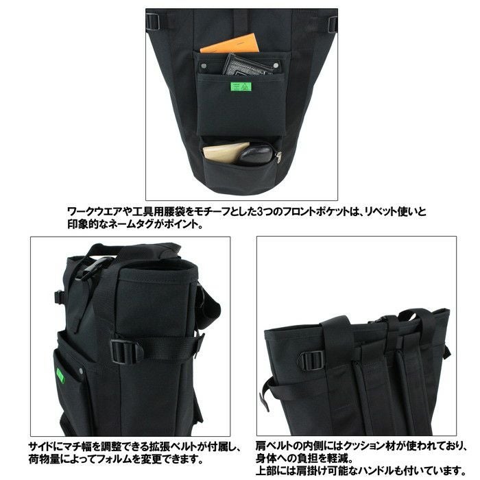 コットンよりも軽量で、色落ちがしにくい特性のあるポリエステルキャンバス生地を使用したリュックタイプのシリーズ。 ワークウエアや工具用腰袋をモチーフとしたフロントポケットは、リベット使いと印象的なネームタグがポイント。 2016AW にグレーとネイビーが新色で加わりました。