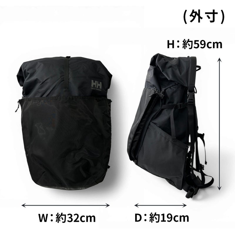 パックラフトの道具一式の持ち運びやテント泊に対応する50L容量です。