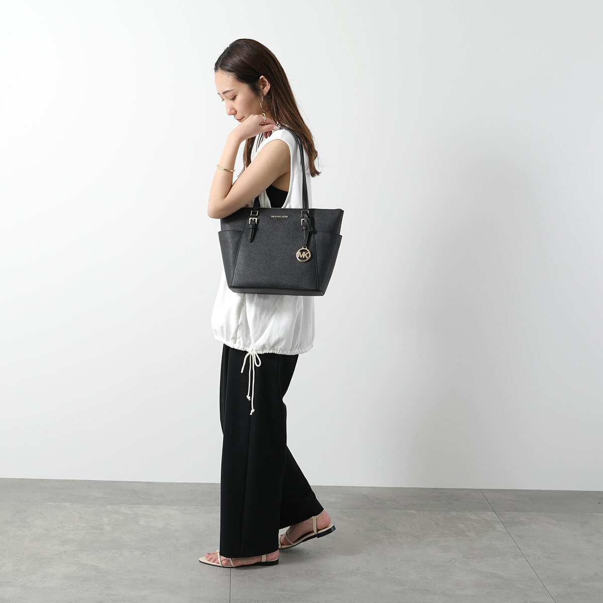 マイケルコースのトートバッグは、ゴールドのロゴチャームや金具がアクセントになり、持つだけで華やかさを演出♪